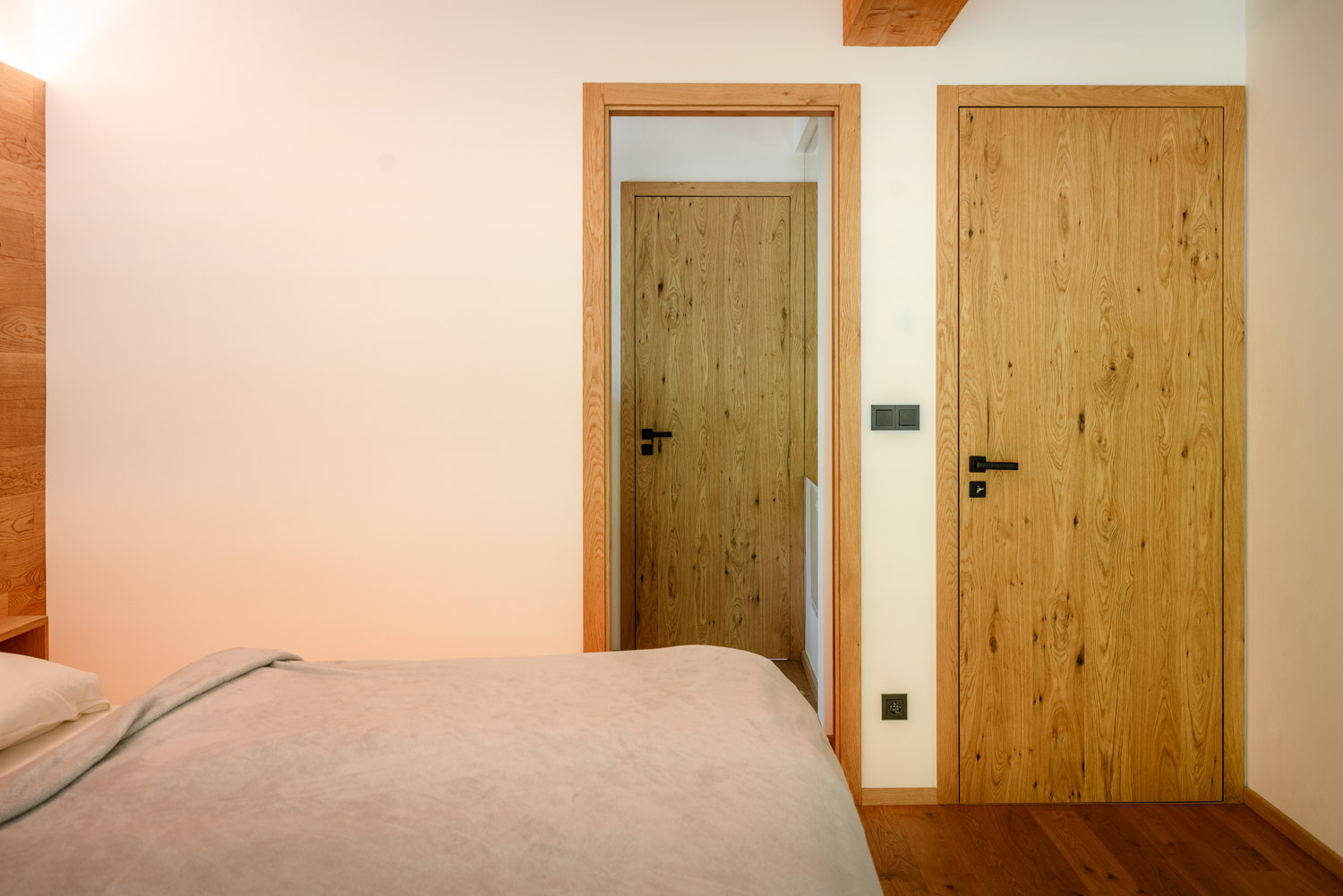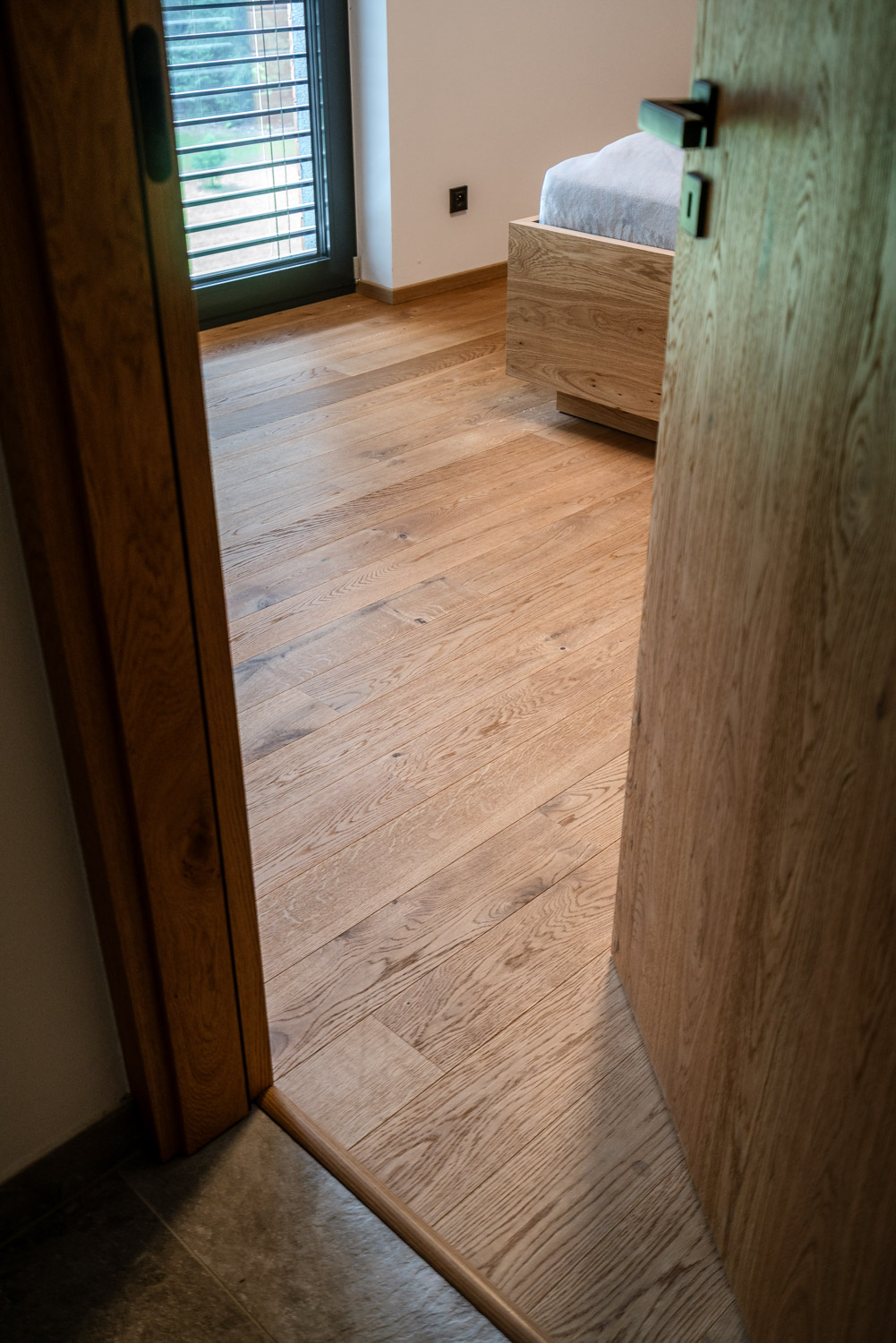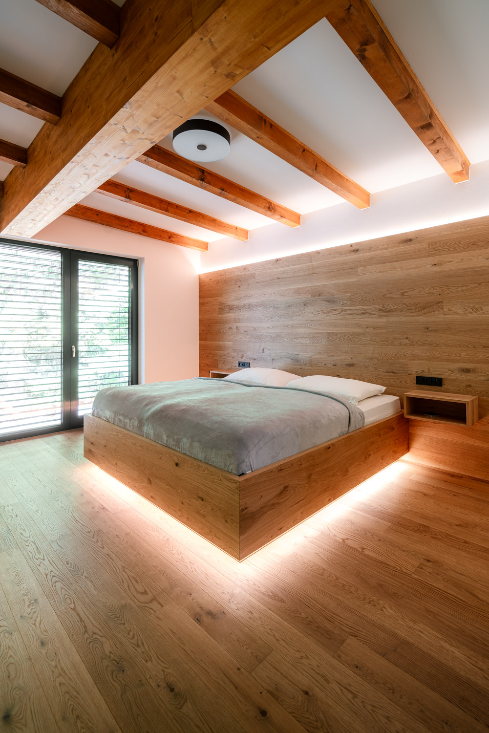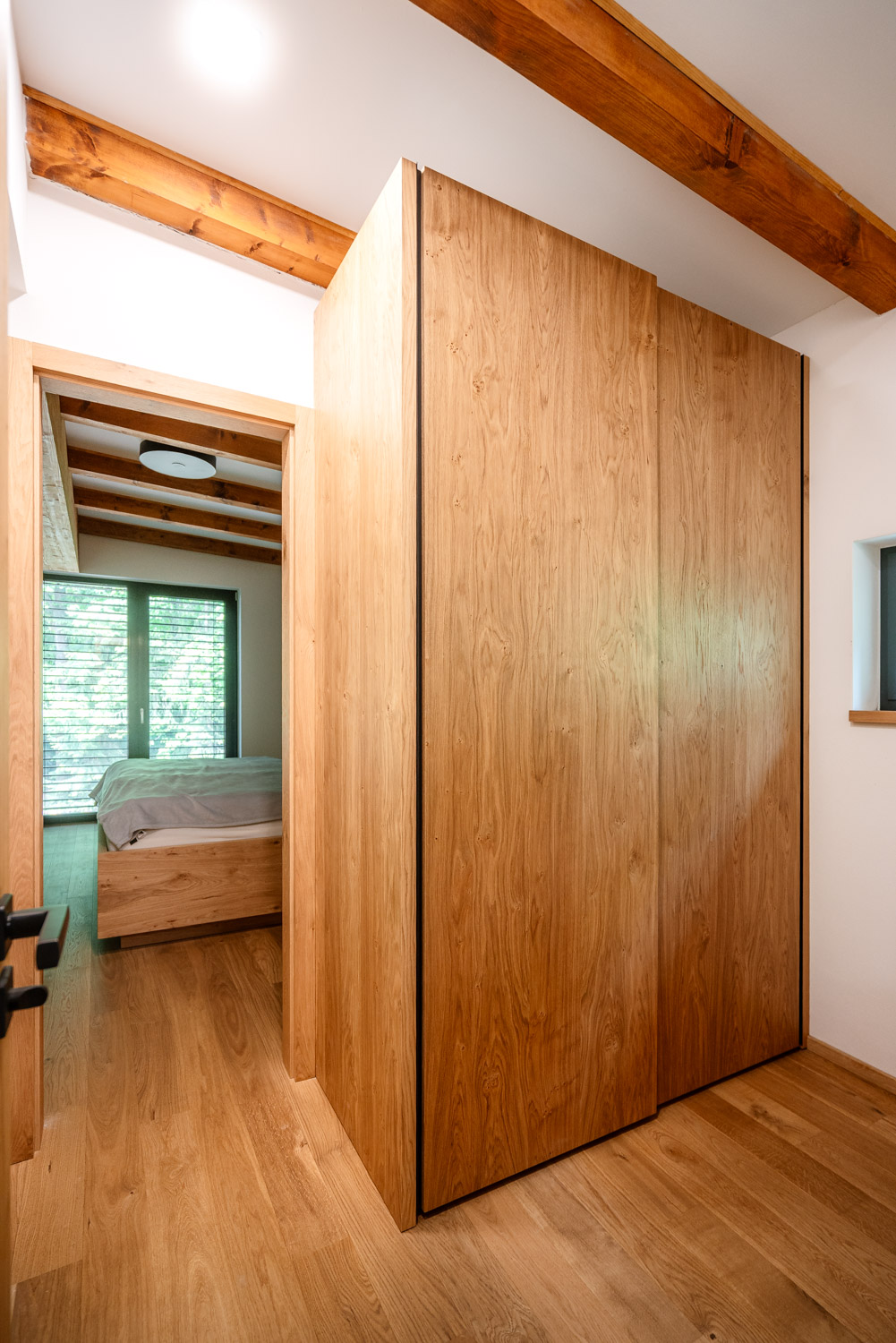 Kompletní interiér v přírodním duchu s dominantním použitím masivního dubu. Dřevěné podlahy, dveře i originální konferenční stolek ze surového kmene propojují celý prostor do harmonického celku. Součástí realizace byly také schody, vestavěné skříně a postele s levitujícím efektem.