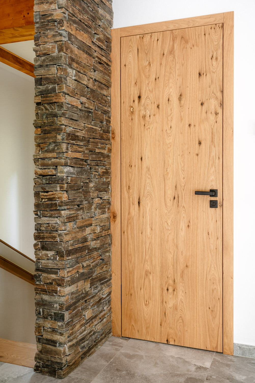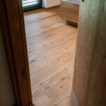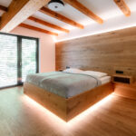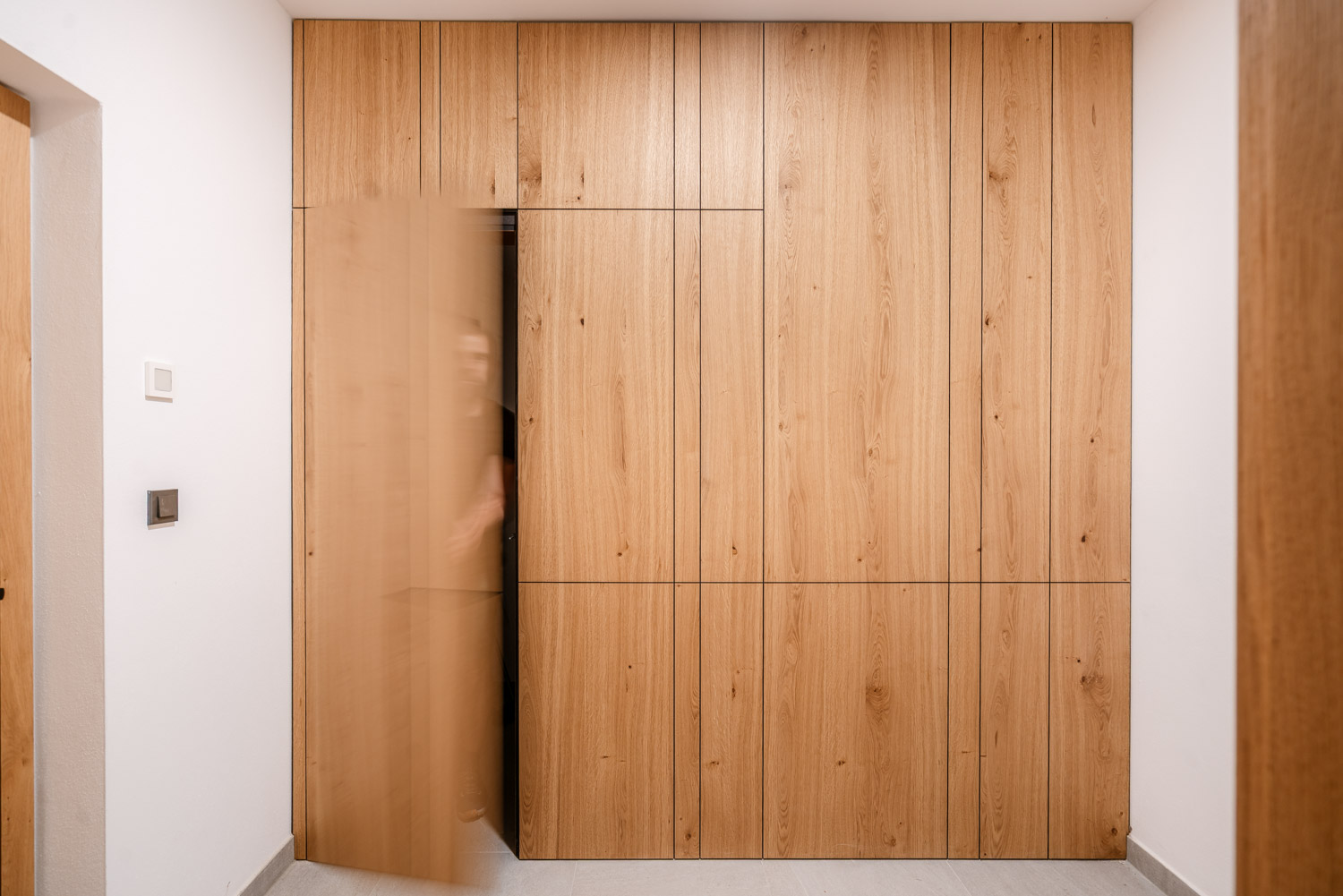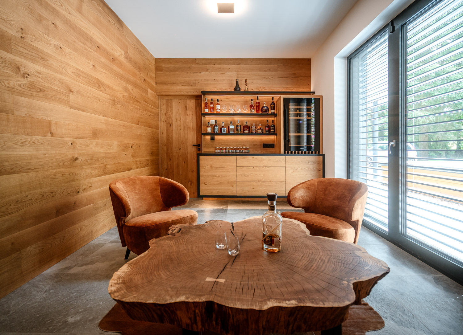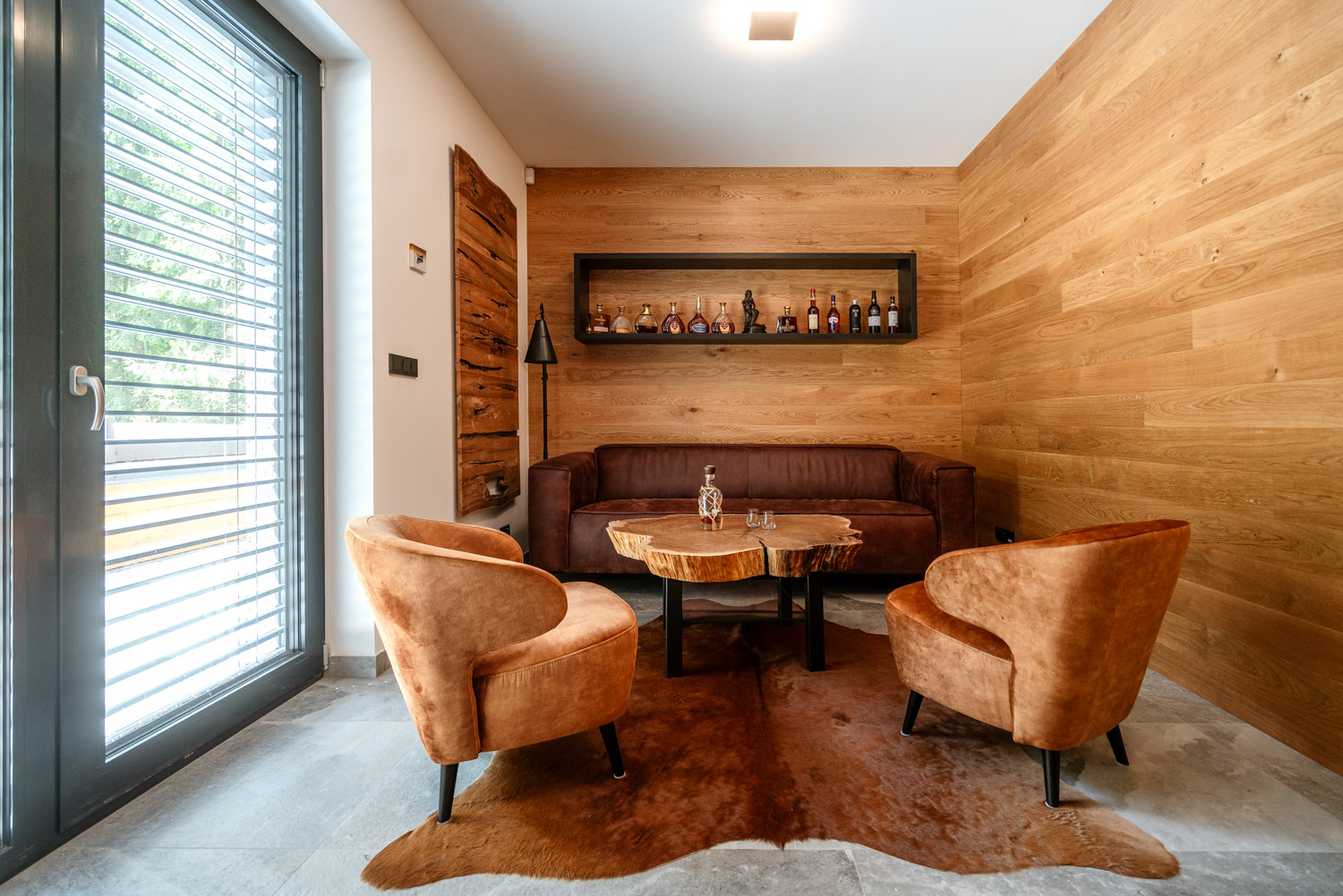 Kompletní interiér v přírodním duchu s dominantním použitím masivního dubu. Dřevěné podlahy, dveře i originální konferenční stolek ze surového kmene propojují celý prostor do harmonického celku. Součástí realizace byly také schody, vestavěné skříně a postele s levitujícím efektem.