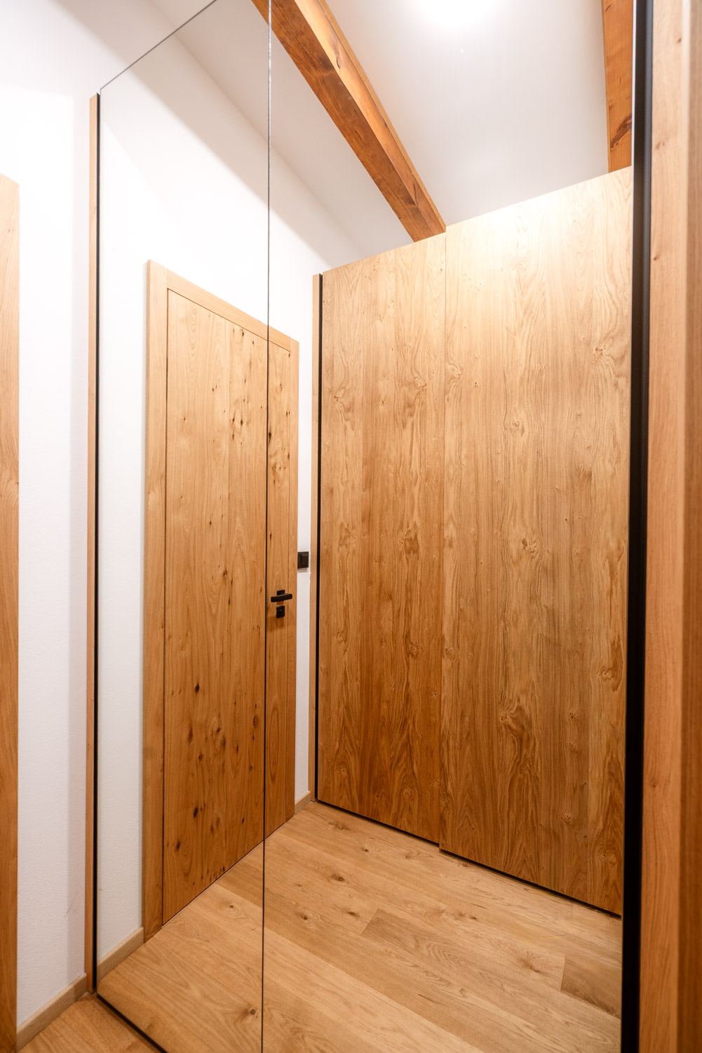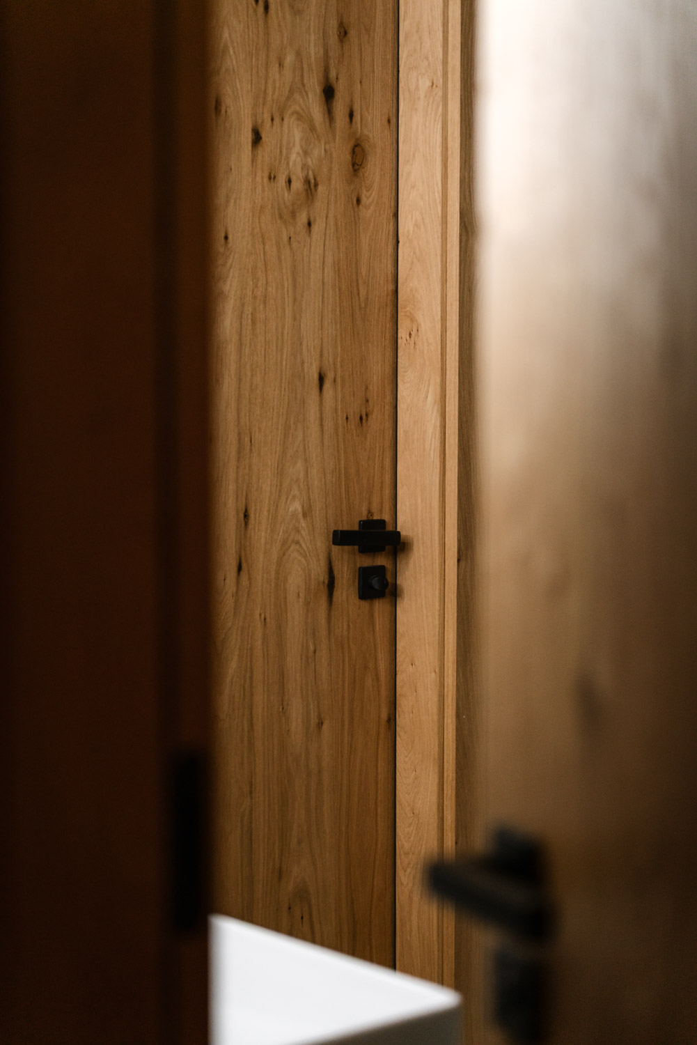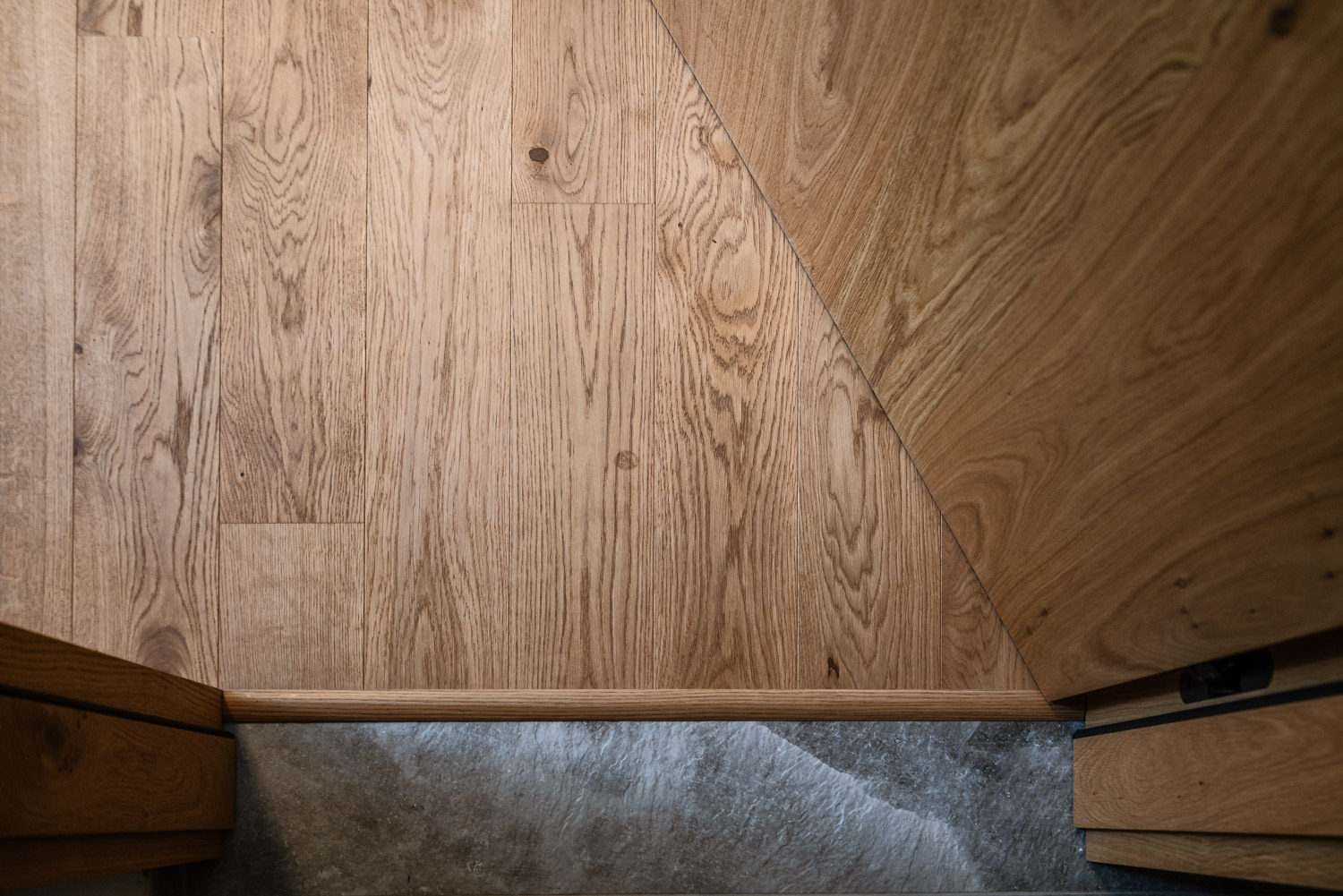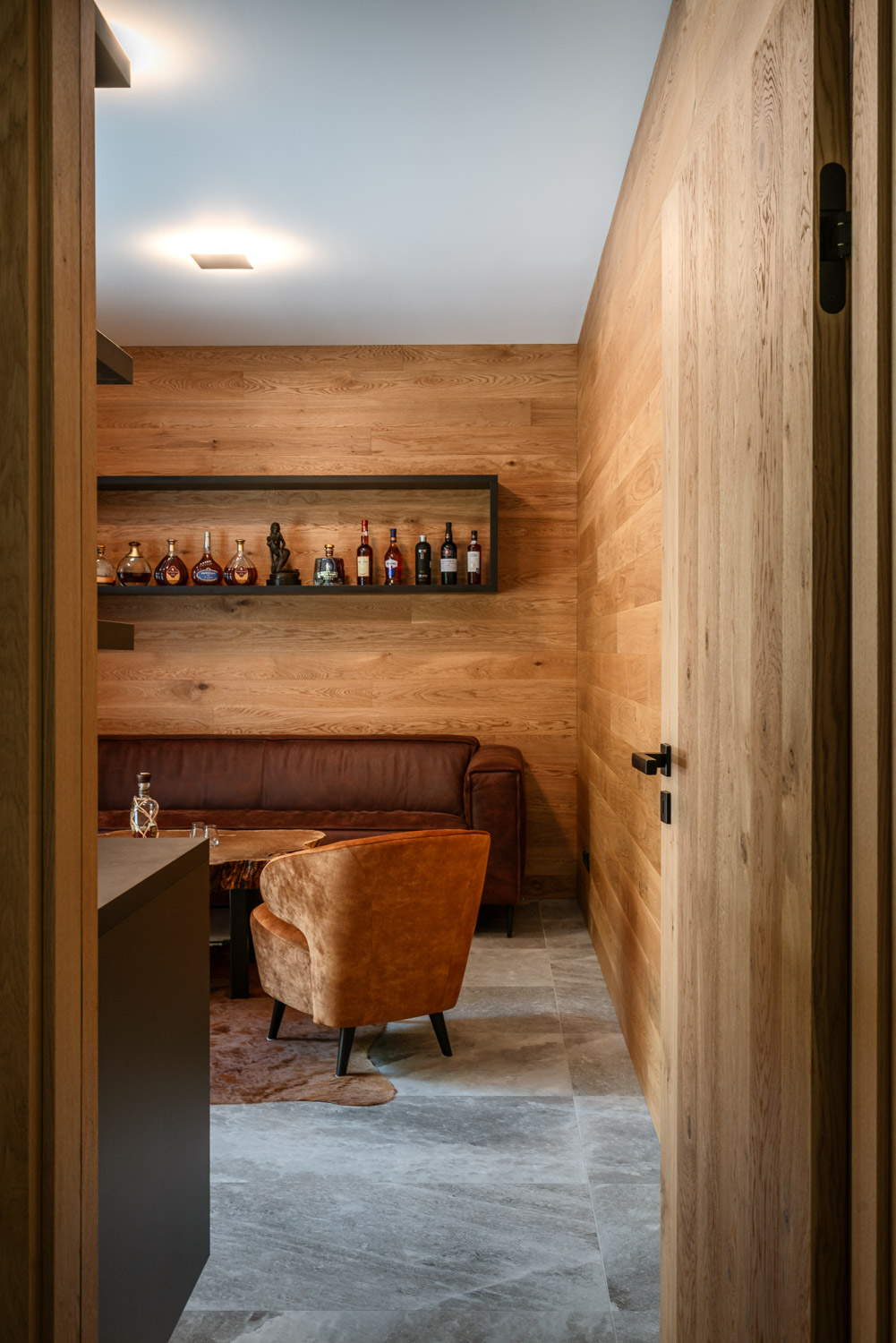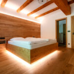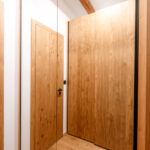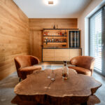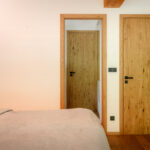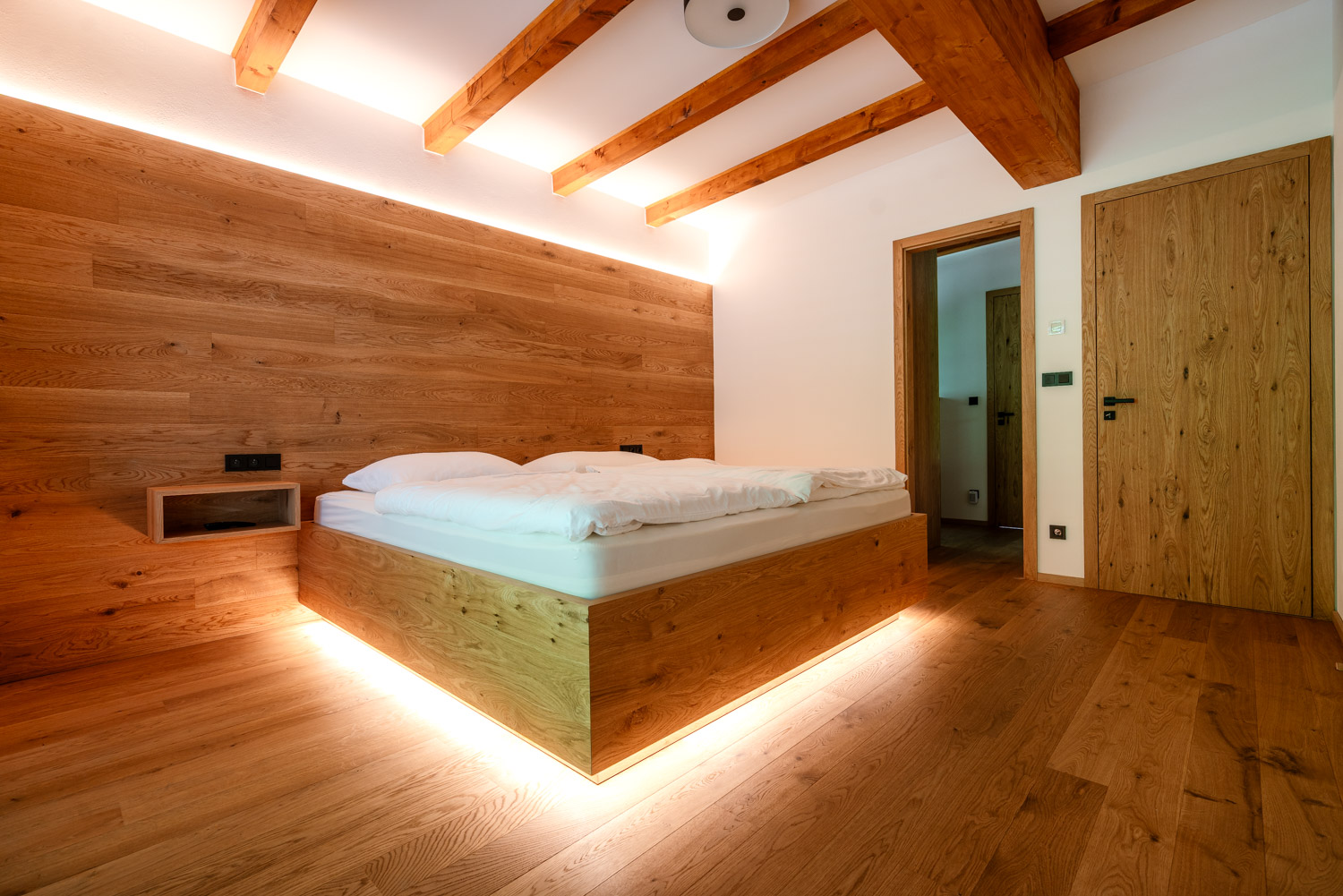 Kompletní interiér v přírodním duchu s dominantním použitím masivního dubu. Dřevěné podlahy, dveře i originální konferenční stolek ze surového kmene propojují celý prostor do harmonického celku. Součástí realizace byly také schody, vestavěné skříně a postele s levitujícím efektem.