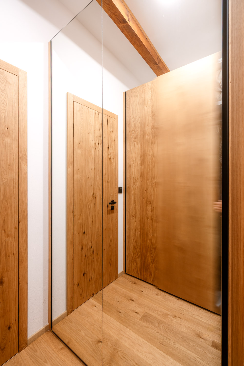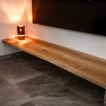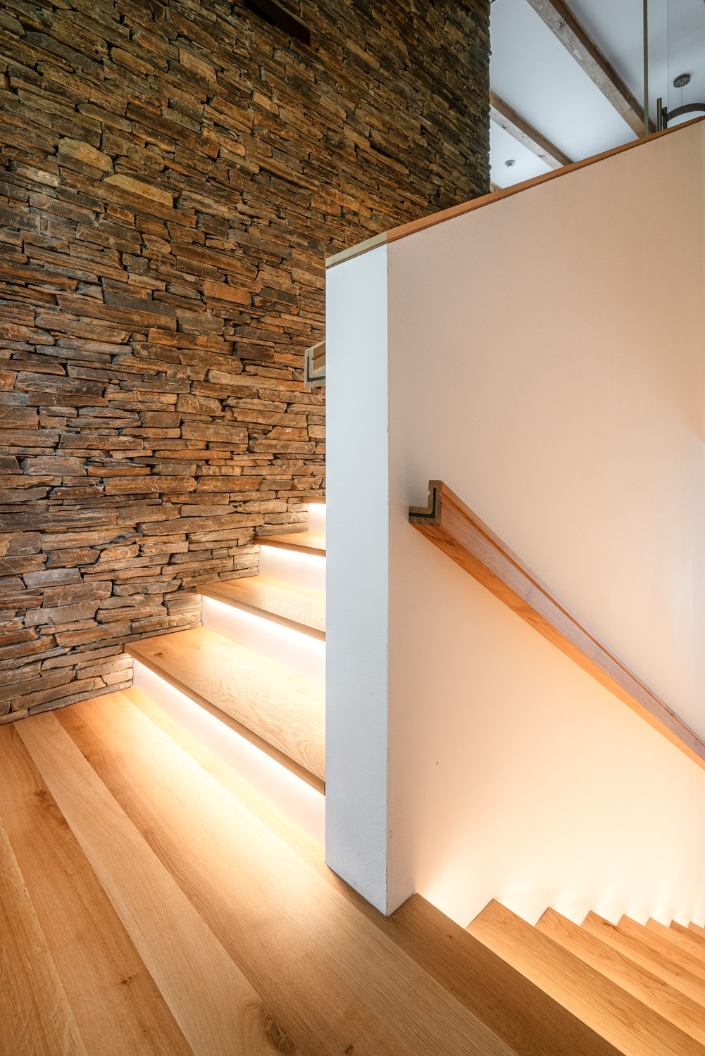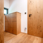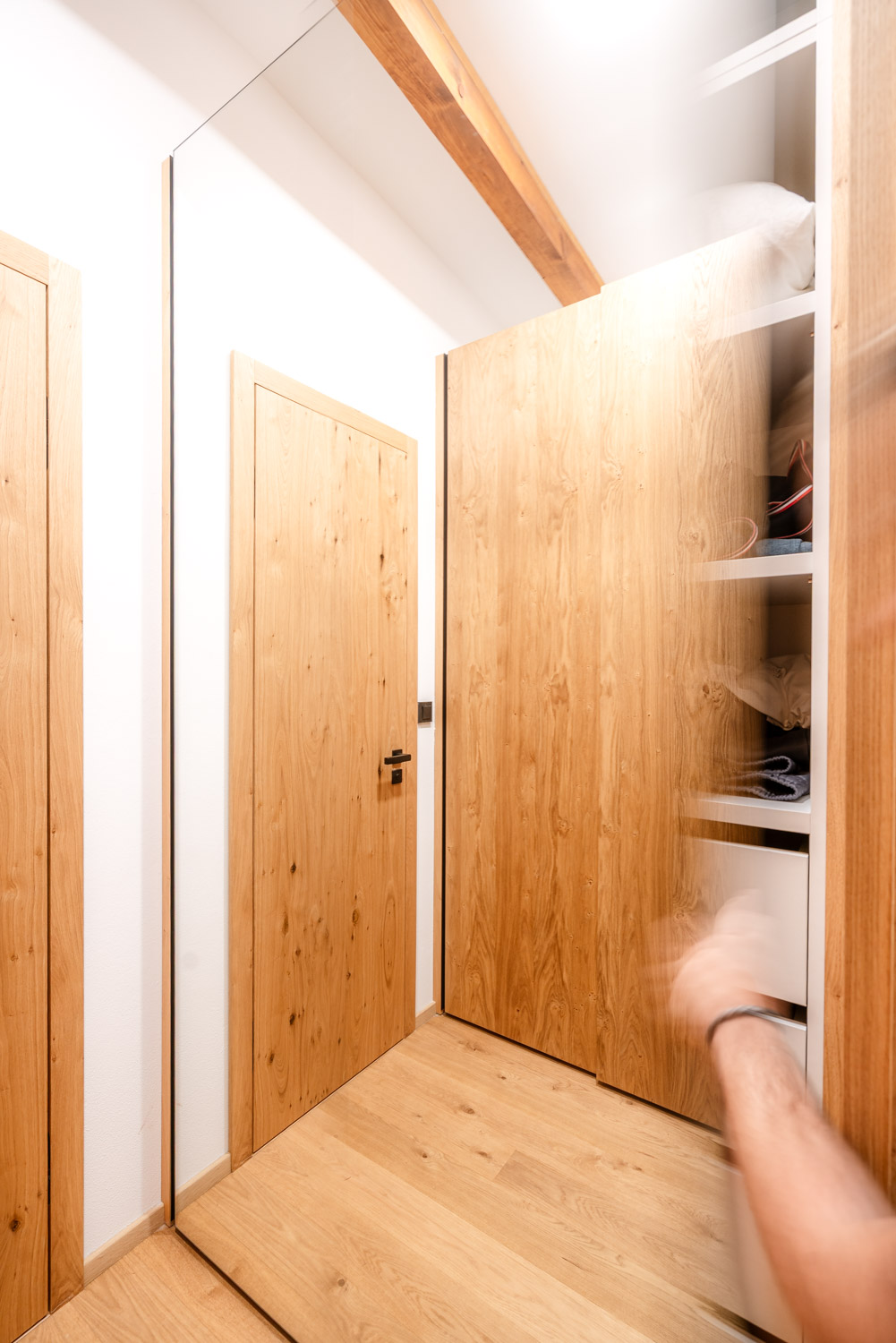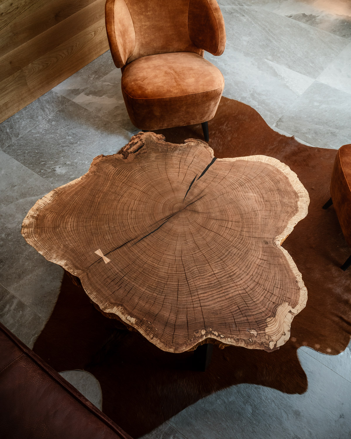 Kompletní interiér v přírodním duchu s dominantním použitím masivního dubu. Dřevěné podlahy, dveře i originální konferenční stolek ze surového kmene propojují celý prostor do harmonického celku. Součástí realizace byly také schody, vestavěné skříně a postele s levitujícím efektem.